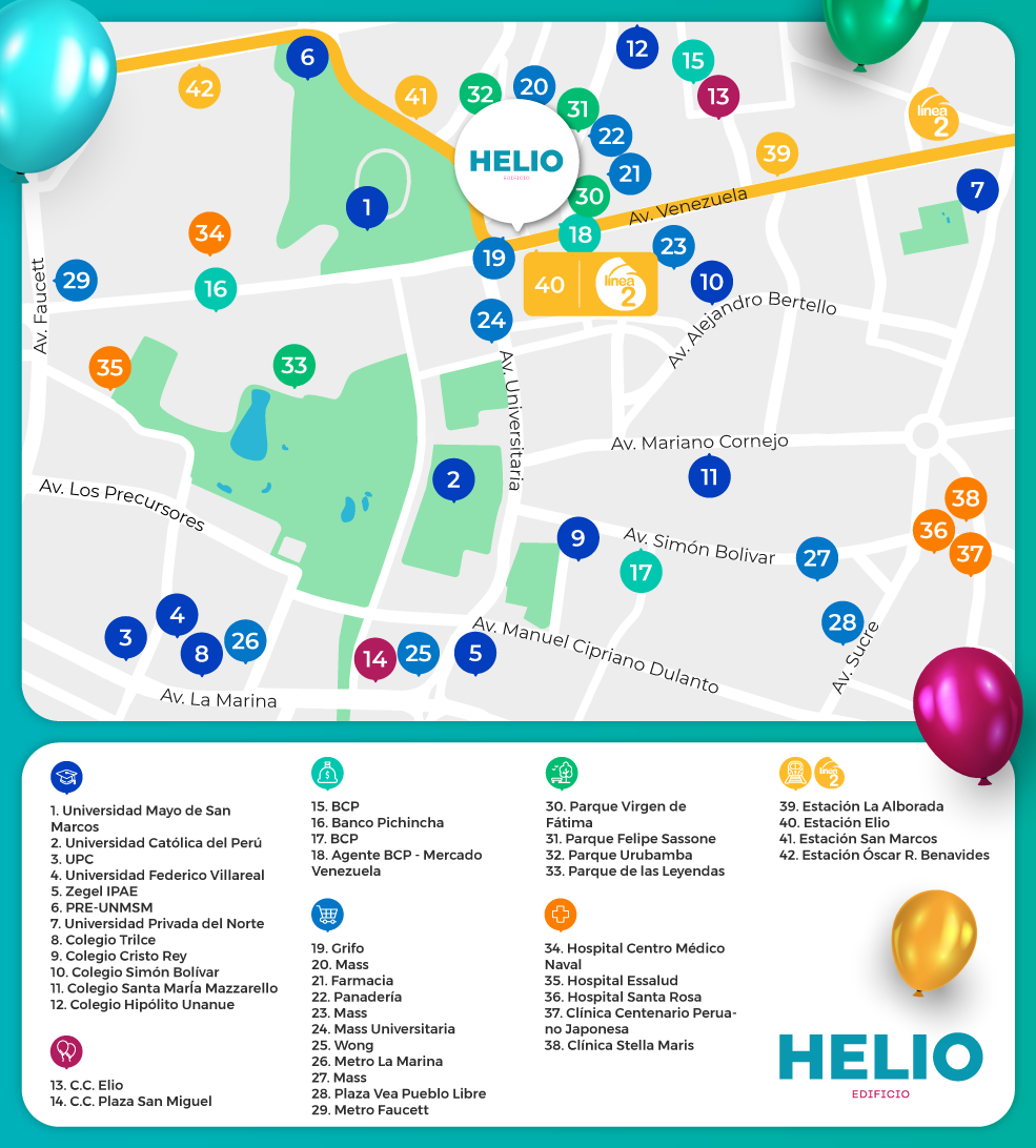 Helio estará ubicado estratégicamente a pocos metros de la Universidad San Marcos y la Universidad Católica. Frente a tu depa estará la estación del primer metro subterráneo del Perú. Este conectará Lima y podrás desplazarte de manera rápida como en las ciudades más avanzadas del mundo. Los ambientes de los departamentos están pensados según la tendencia de los nuevos estilos de vida, con espacios funcionales e innovadores. Contarán con amplias estaciones de trabajo y balcones que te harán sentir libre desde tu hogar. Las áreas sociales de Helio te llevarán a crear momentos inolvidables y seguros con las personas que más quieres. Eleva tu forma de vivir por los cielos con Helio.